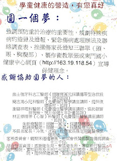 相關網址〉告訴小朋友要小心,但是光靠校方昰不夠的,如果加上家長在日常生活當中不斷的叮嚀,學童的安全健康防護罩才能發揮更大的功效,護士阿姨與親師長們一起為未來主人翁加油喔!