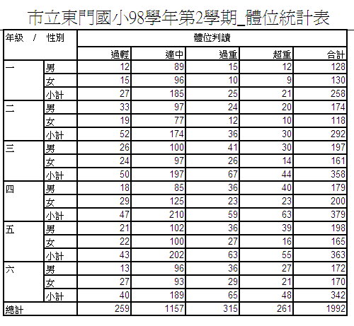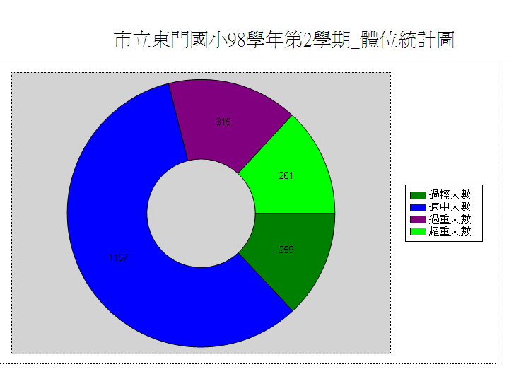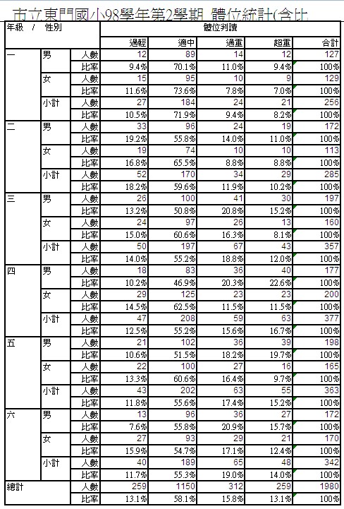 東門---體位暨體控班宣導網 護理師羅靜容辦理990419-990423體控班體能訓練 照片請點我990422體控班營養課程 照片請點我 體位統計(含比率) 體位統計 體位統計圖 引用資料請尊重註明來源處--護理師雅琳阿姨