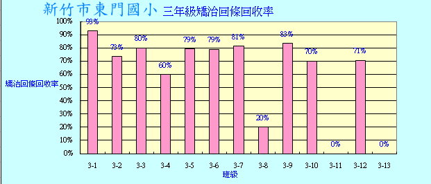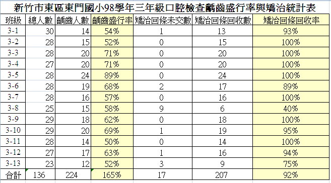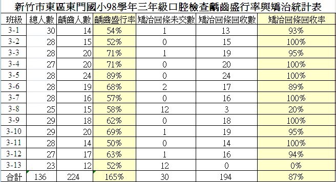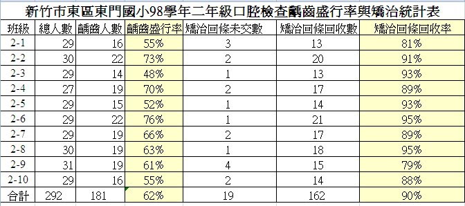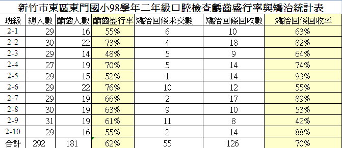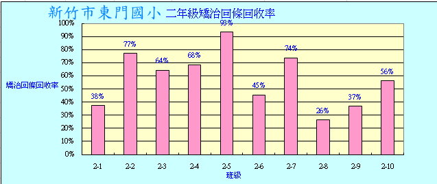 990614公告:依據教育處體健科衛生評鑑標準矯治回條率需達85%〈牙科、視力、一四年級健檢〉6/1第一次公告經老師的協助,各班完成率已顯著增加。明天將請未達85%班級老師轉發「第二次牙科追蹤通知單」,貼於班級聯絡簿,請家長為了學童口腔健康務必撥冗帶至牙科醫療院所複檢,「第二次牙科追蹤通知單」於990625前回擲健康中心,謝謝您與校方的配合!