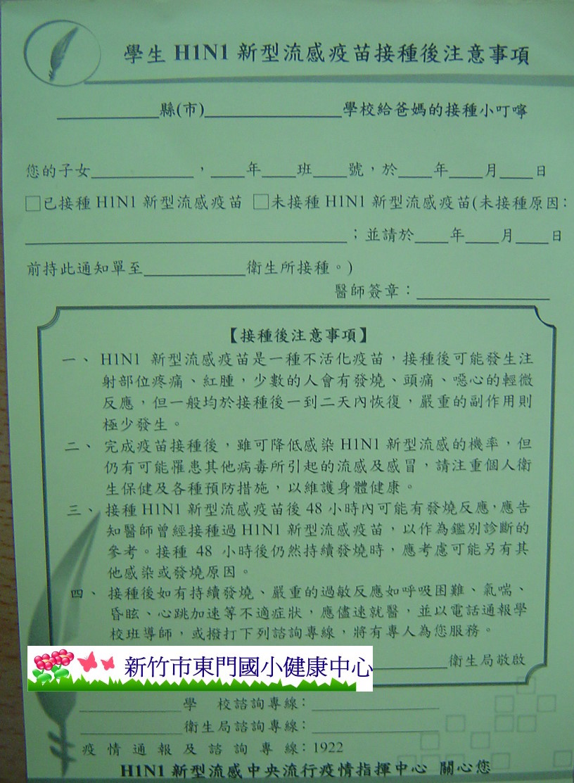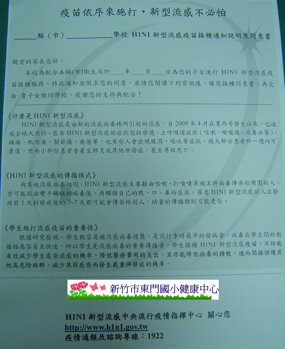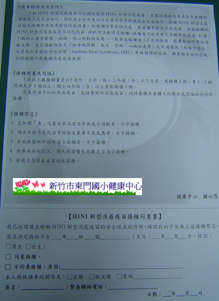雅琳阿姨:拜託東門的家長請稍安勿躁,衛生所接種的對象是前面的順位〈他們門診打針除三歲以下六七種暨訂疫苗也有老人家肺炎鏈球菌疫苗....已夠忙的啦!您自己跑去他也不能幫你打〉,待週四衛生局與合約醫院確定日期到東門打針時,我們會統一發一到六年級學生家長同意書。屆時若同意但當日因身體不適不能接種,也不是去衛生所補打,必須帶學生健保卡至負責東門的醫院補打。H1N1新型流感疫苗是非常安全、有效的疫苗,必須由家長簽名同意後才可施打;接種前,學校及合作醫院會為每名學生實施健康評估及核對名冊。太緊張--暈針怎麼辦?任何預防針都會有過於緊張產生暈針現象,平躺休息皆可減緩。